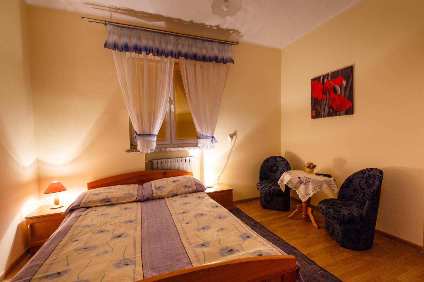 Domek z 2 sypialniami. The fireplace is a top feature of this chalet. Boasting a private entrance, this chalet also comes with 1 living room, 2 separate bedrooms and 1 bathroom with a shower. Meals can be prepared in the well-fitted kitchenette, which features a refrigerator, kitchenware and a microwave. The chalet features a dining area, a wardrobe, heating, a flat-screen TV, as well as garden views. The unit has 4 beds. Domek - 4 osobowy. ;
